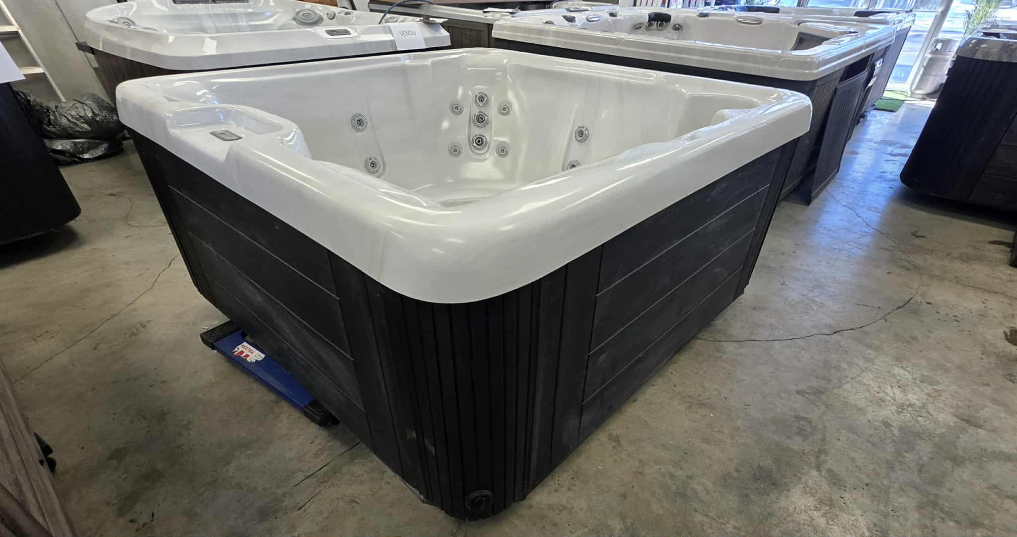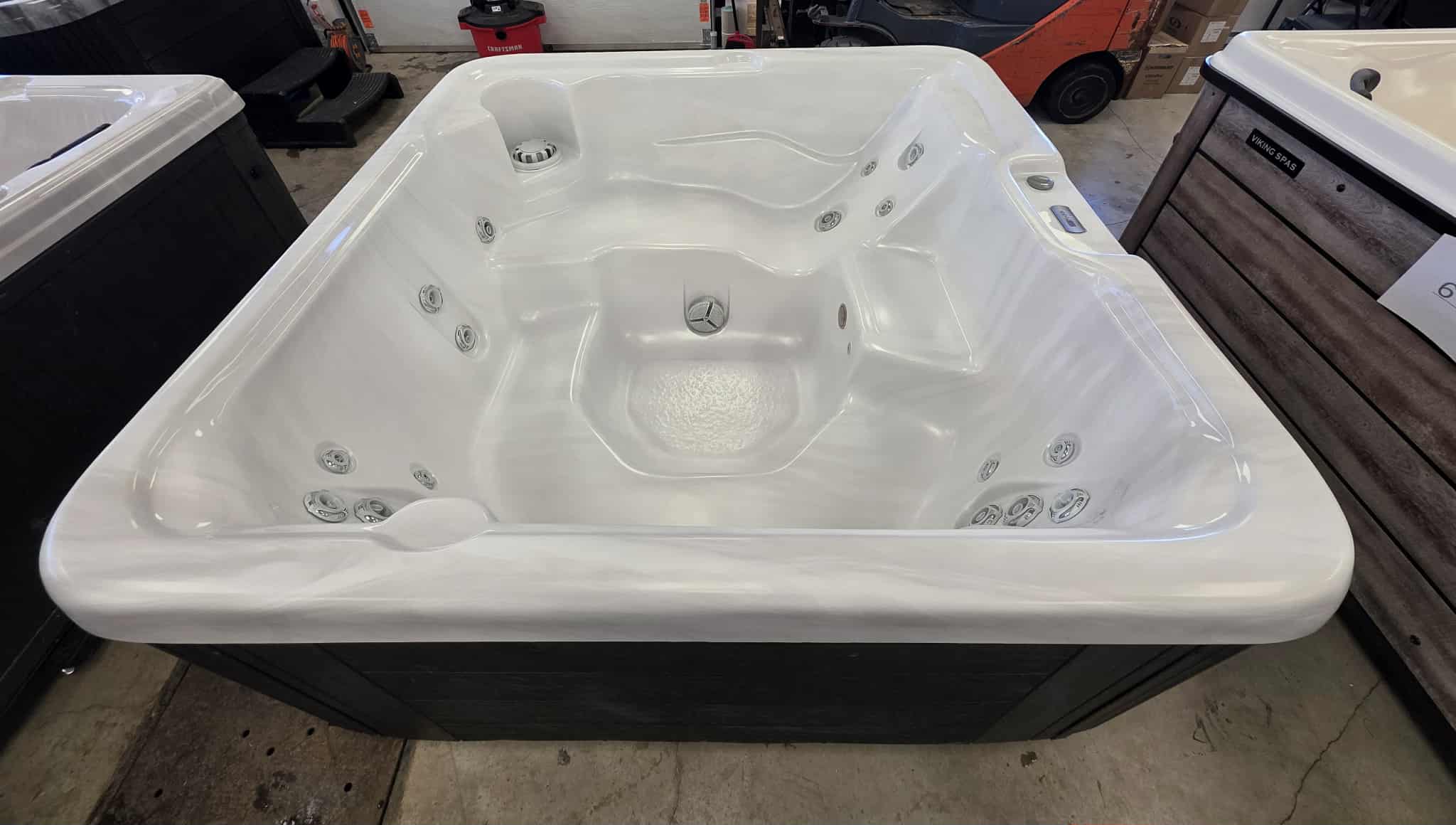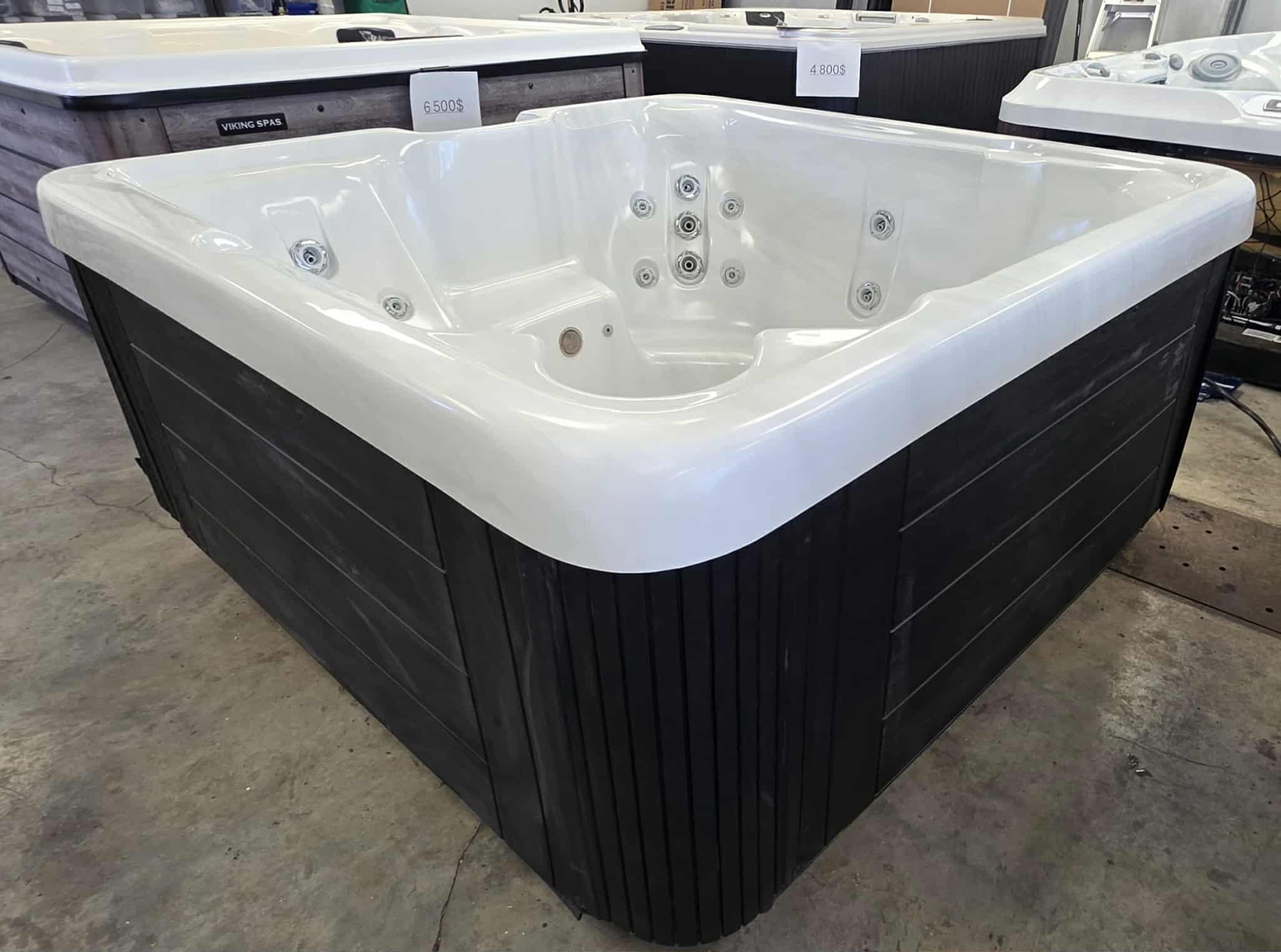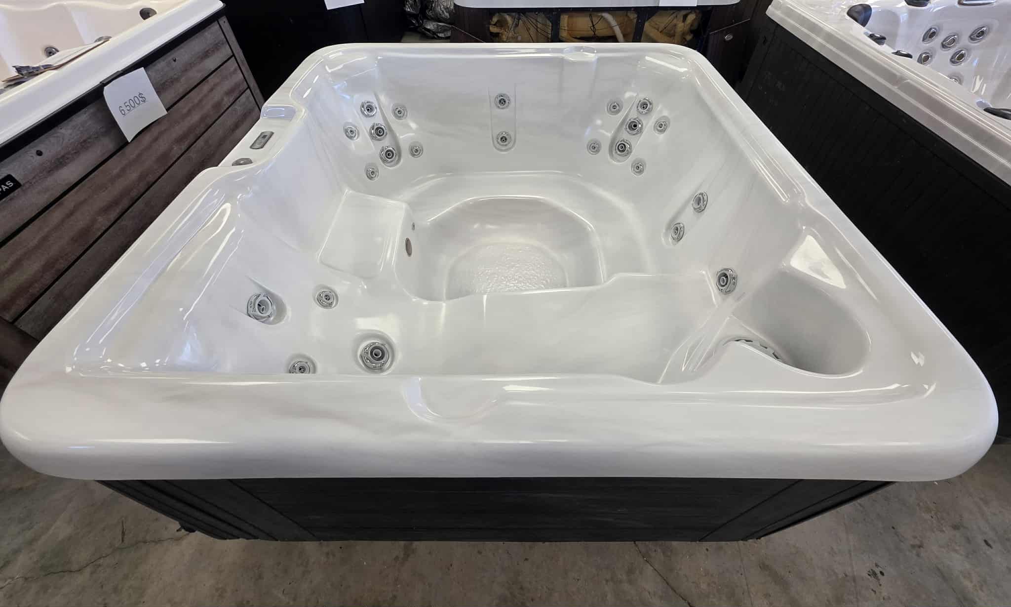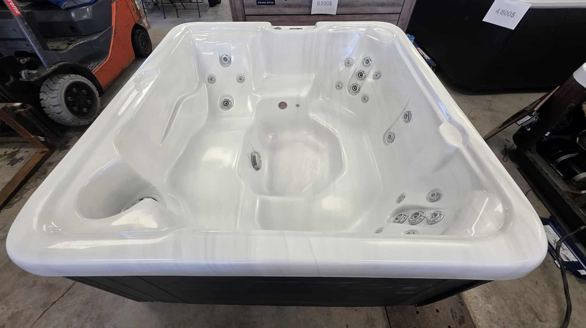 Dimensions : 77″ x 77″ (format idéal, ni trop grand, ni trop petit). Capacité : 5 places, incluant une chaise longue pour une relaxation totale du corps. Massage : 23 jets stratégiquement placés pour un hydro-massage efficace. Design : Coque blanche marbrée élégante avec cabinet au fini bois sombre, très moderne.